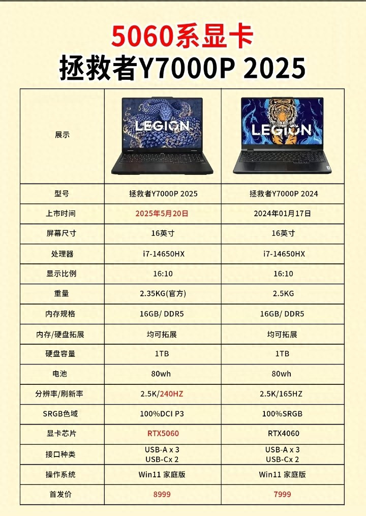 8:终末在价钱方面,2025款挽回者Y7000P的首发价钱为8999元,而2024款的首发价钱为7999元。这1000元的差价,主要对应的是显卡从RTX 4060到RTX 5060的跨代升级,以及屏幕从165Hz到240Hz刷新率和从100% sRGB到100% DCI P3色域的品性教训。轮廓来看,挽回者Y7000P 2025款是一款针对性极强的迭代居品。