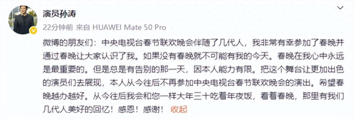 1月26日,@演员孙涛 发文称从今往后不再参加中央电视台春节联欢晚会的演出: