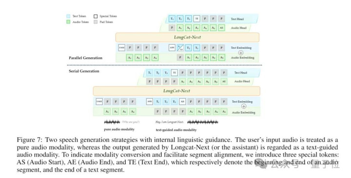 惟一比拟狠的一丝是,在文本开发音频的统一建模下,LongCat-Next同期支执并行生成与串行生成两种战术,使得模子可以在生成速率与语音准确性之间机动量度。