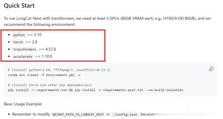 不外要想使用LongCat-Next,除了硬件上需要至少3张80GB显存的专科显卡(如英伟达A100/H100),软件配置条款如下: