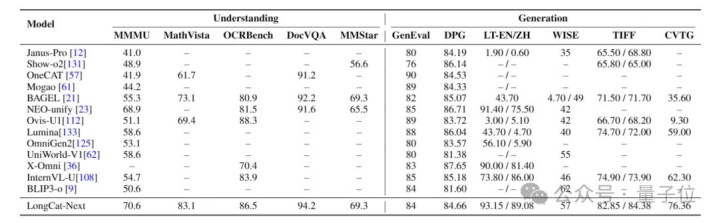 字据之一是,在OmniDocBench这个涵盖学术论文、财报、行政表格等各式复漫笔档的多模态基准测试上,LongCat-Next的收获不仅卓著同类多模态模子,还跳跃了专门作念视觉和会的模子。
