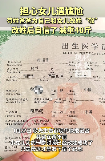 “为了小女儿,苟姓改敬姓。历时月余终成功,三十岁改名改姓。”近日,一名网友发帖称,为小女儿和自己改名改姓成功,发帖纪念一下,苟姓改敬姓。该帖获得千余名网友点赞评论。1月27日,现代快报记者联系上了敬先生。他说,其实在两年前,小女儿大约一岁时就已经改姓成功了,只是最近才想发下留个纪念。