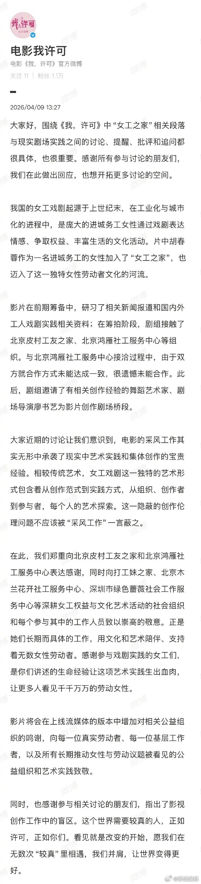 #我许可回答侵权舞台剧#近日,电影《我,许可》中的女工舞台剧桥段被指侵权鸿雁社工舞台剧。刚刚,lol投注@电影我许可回答称在筹拍阶段剧组斗殴了北京鸿雁社工处事中心等组织,但很缺憾未能合营。尔后邀请了有关连创作教养的跳舞艺术家、戏院导演廖书艺为影片创作戏院桥段。后续影片将会在上线流媒体的版块中加多对关连公益组织的鸣谢。片中戏剧段落导演@廖书艺Candy也从创做念路角度做出回答。(新浪文娱)更多音书:#薛之谦满头斑秃和水泡##瘫痪女孩误买邓紫棋演唱会票平台拒退##金莎孙丞潇领证##孙杨张豆豆有孩子了##安妮海瑟薇在韩国收到拈花高跟鞋##papi酱已退出papitube#(裁剪:杨雨桐;审签:艾渝)