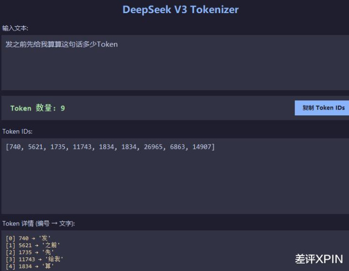 于是我作念了一个token蓄意器,知人善察这一块。。我下载的是DeepSeek V3的tokenizer,等于用来数token的阿谁东西,然后让AI帮我打包成了个可推论文献。
