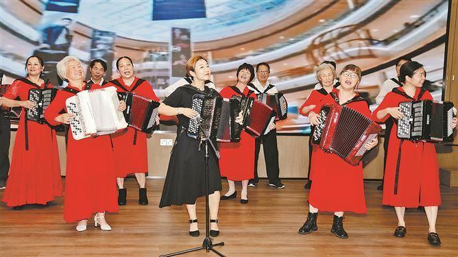 厦门老年大学巴扬手风琴获胜生在期末汇演上合奏《兰巴达》。