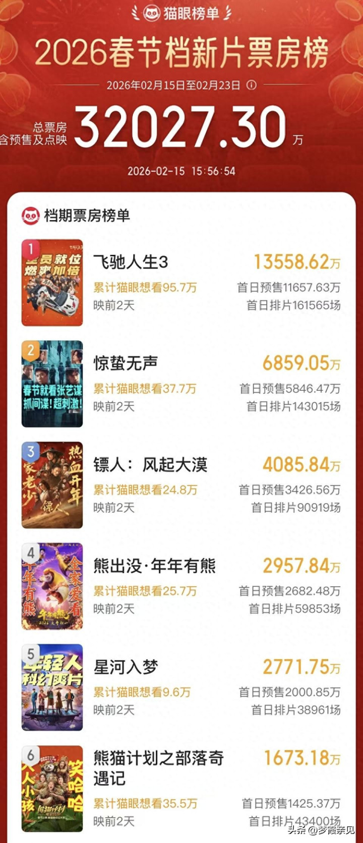 本年《飞奔东谈主生3》一上来就占据统统上风,沈腾加韩寒,又是笑剧,最相宜春节全家不雅看。预售一开就接近1.9亿,简直占掉四成份额。影院一看数据好,坐窝加大排片,酿成越排越多、越卖越火的地方。