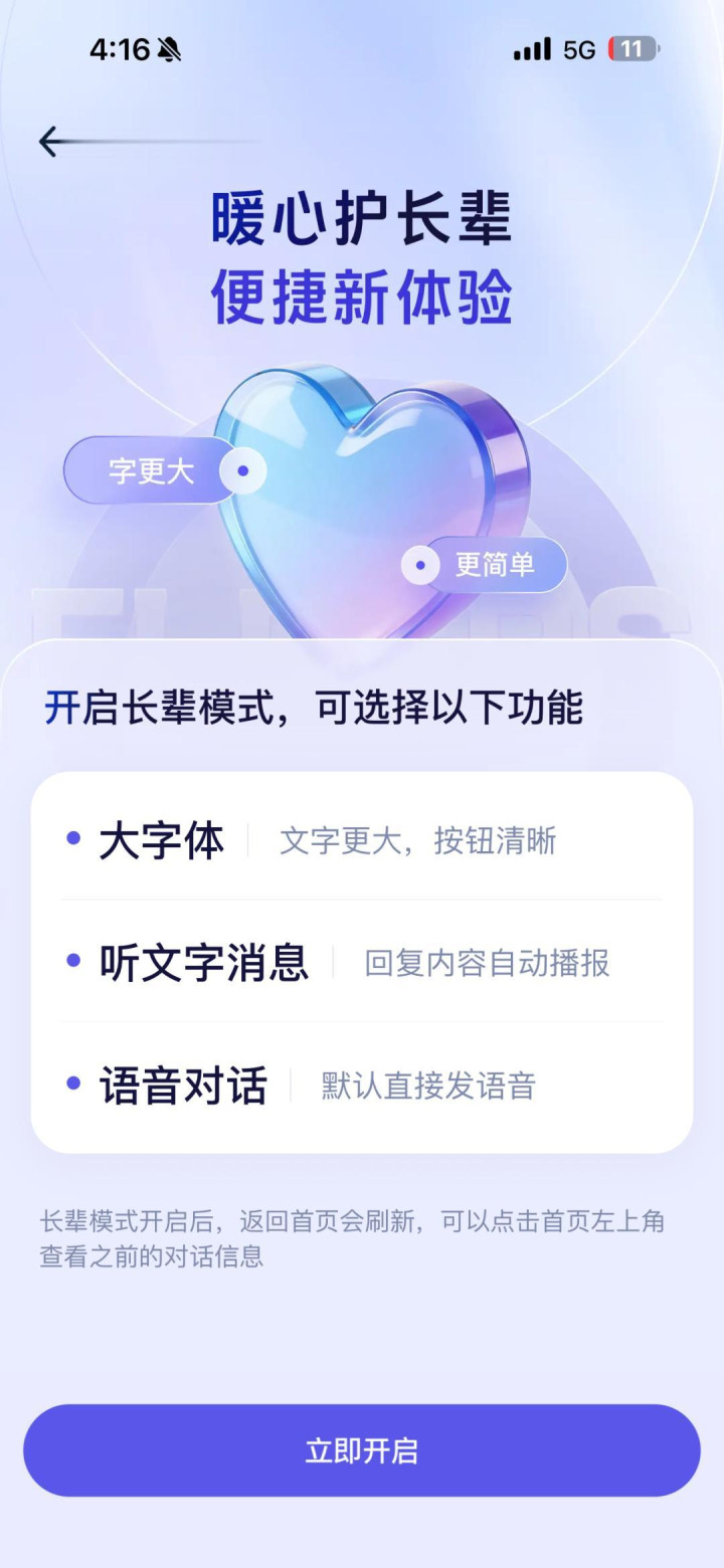 它有成心的适老化矫正。字号不错调特大,无须打字,按住话语就能问。