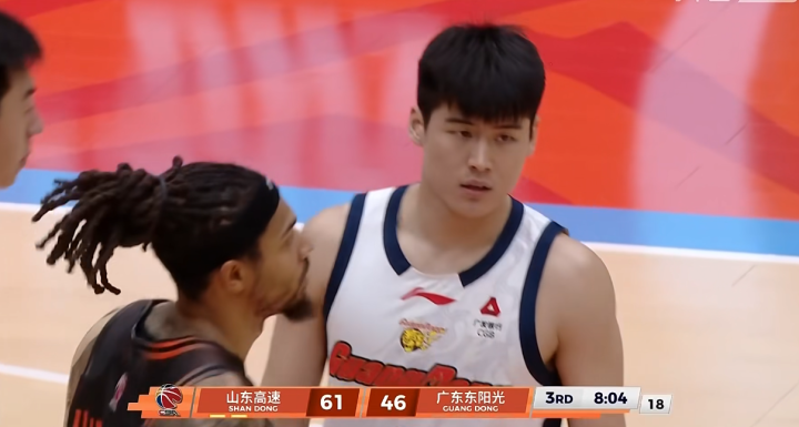 5分05秒,徐杰飚进止血三分吹响反击军号,奎因抢下篮板补进后再和徐杰打出连线制造2+1,片刻低迷后,奎因再度火力全开4回合内连得7分,广东一波10-2打出,松开分差来到58-69。