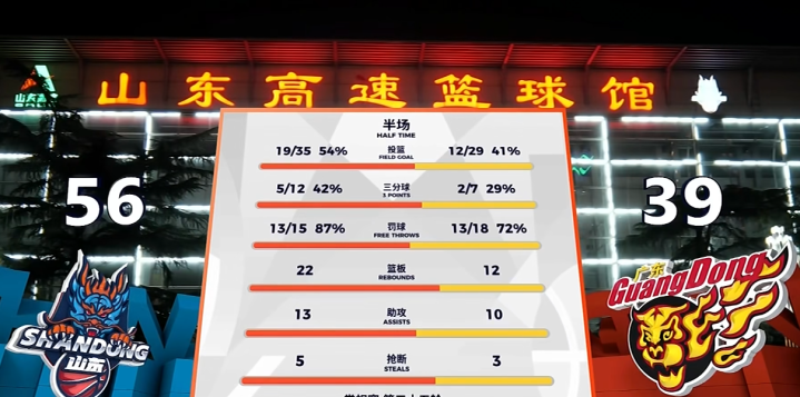 山东队后半节相连飚进了4记三分(许梦君成最大奇兵),还比广东多抢了4记篮板,表里全面占优,第二节后半段山东打出一波22-8,半场打完,山东非凡来到56-39广东。