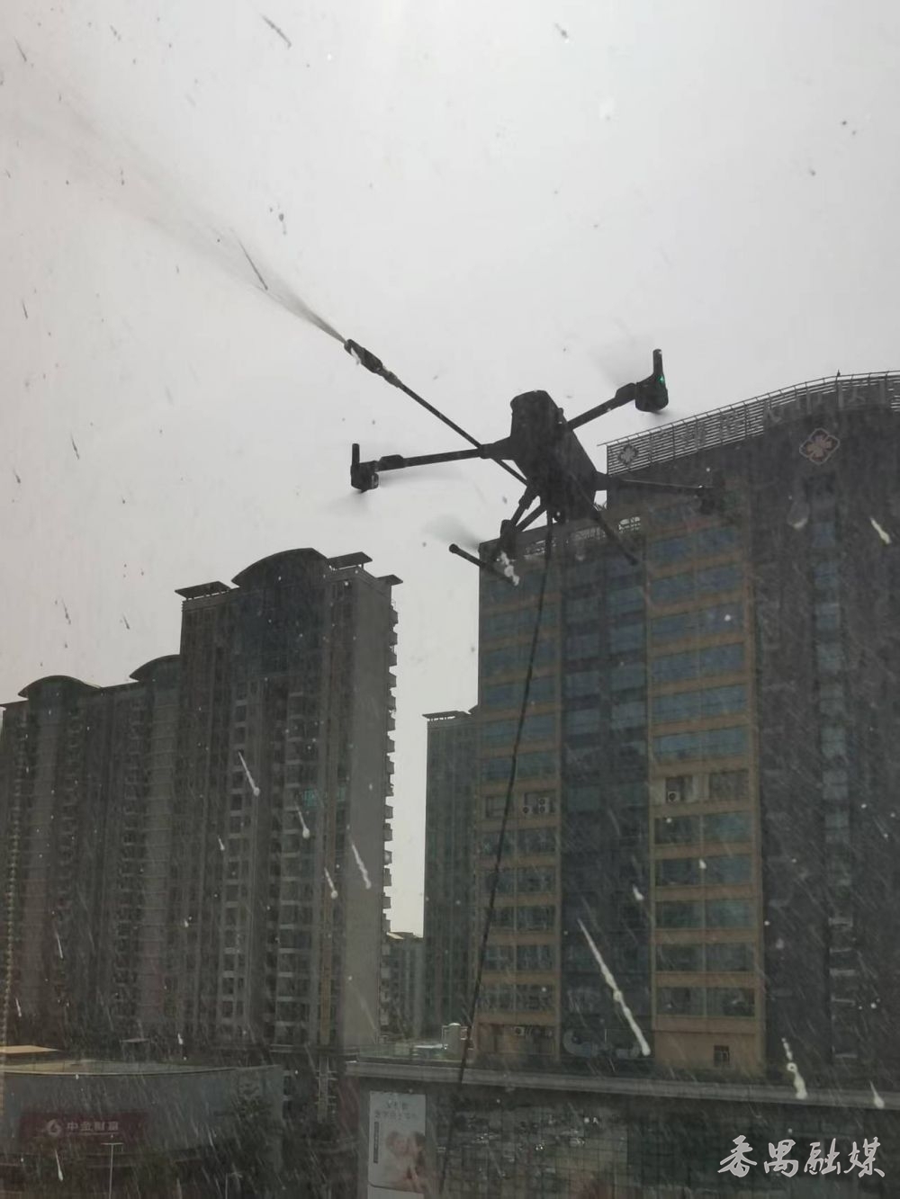据金湛云相关矜重东谈主先容,这次担纲高空清洁重负的是经专科化阅兵的无东谈主机平台,主要针对高空清洁需求完成深度专科化建设,搭载定制化高压清洗喷头与专科双频智控大地系统,兼具翱游踏实、操控精确、远距离功课的专科上风,可纯真适配种种高层建筑外墙清洗场景。功课依托高压雾化喷淋本领,将清洁液均匀雾化喷洒后,通过高压水流高效解析墙面污垢,全程绿色环保、清洁截止权贵。